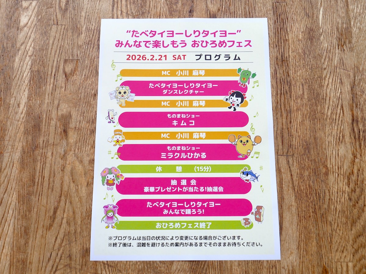 タイヨー ホームページへ戻る おいしい理由ワケ おすすめしたい理由ワケ お得な情報 タイヨーの取り組み 人気記事ランキング 2026.02.21 ~ 2026.03.21 タイヨーの取り組みタイヨーのテーマソング&MVが誕生♫ 家族みんながノリノリになる『食べタイヨー! 知りタイヨー?』をご視聴ください 545 おいしい理由フライパンだけの簡単調理◎ オシャレな洋風の魚料理『白身魚バジルソース味』で食卓を彩ろう! 210 タイヨーの取り組み【タイヨー 銚子店のココに注目】まるで魚市場! 銚子漁港から水揚げされた鮮度抜群の朝獲れ生魚がスゴイ! 175 おいしい理由こんなに美味しいのは食べたことがないと大反響! レーズンたっぷり『タイヨー レーズンパン』が菓子パン好きを虜にするワケ☆ 140 おいしい理由サッと焼くだけ完成★ タイヨーこだわりのタレで味付けた『牛プルコギ』が激ウマすぎる!! 140 教えて!ねころっけ とは ホーム > タイヨーの取り組み > 小川麻琴さん・ミラクルひかるさんが出演★ 「“たべタイヨーしりタイヨー” みんなで楽しもう おひろめフェス」を開催しました! 選択してください すべて おいしい理由 おすすめしたい理由 お得な情報 タイヨーの取り組み タイヨーの取り組み 2026.03.21 小川麻琴さん・ミラクルひかるさんが出演★ 「“たべタイヨーしりタイヨー” みんなで楽しもう おひろめフェス」を開催しました! 2026年2月21日(土)、神栖市文化センターにて「“たべタイヨーしりタイヨー” みんなで楽しもう おひろめフェス」を開催しました! こちらはタイヨーのテーマソング『たべタイヨー しりタイヨー』のリリースを記念したイベントです。 *『たべタイヨー しりタイヨー』の動画はこちら https://youtu.be/cSqwxipt5WY?si=RD31f_4RvJpusdIn 小川麻琴さん・ミラクルひかるさん・キムコさんが出演し、大盛り上がりとなったイベントの様子をお届けします♪ 「“たべタイヨーしりタイヨー” みんなで楽しもう おひろめフェス」の様子 ◆プログラム◆ こちらが当日に配布されたプログラムです。 15:00〜17:00まで2時間にわたって、ダンスレクチャー・ものまねショー・抽選会などの楽しい催し物が盛りだくさんでした! 裏面には『たべタイヨー しりタイヨー』の歌詞も記載されています♪ ◆開場◆ 今回のイベントは、タイヨーのコジカカードをご利用のアプリ会員様を対象に、お申込みいただいた方の中から抽選でご招待いたしました。 お子様連れのご家族を中心に、たくさんのお客様に神栖市文化センターへお集まりいただきました! ◆オープニングMC◆ 開演と同時に、当イベントのMCを務めていただいた元モーニング娘。の小川麻琴さんが登場☆ 会場は一気に熱気に包まれました! ◆『たべタイヨー しりタイヨー』ダンスレクチャー◆ 振付担当のアヤノ先生とキッズダンサーが舞台に上がり、さっそく『たべタイヨー しりタイヨー』のダンスレクチャーを行いました。 お客様も立ち上がり、一緒にフリを覚えました! ◆ものまねショー キムコ◆ ものまね芸人 キムコさんによる、ものまねショー♪ キムコさんは茨城県鹿嶋市出身で、ものまねバトルでの優勝経験もある実力派です。 チャーミングなものまねで、子供達から「かわいい」の声が多数! タイヨーには40年通っていて、チューリップチキンを食べるのがルーティンなんだそうです。 会場はなごやかな笑顔に包まれました☆ ◆ものまねショー ミラクルひかる◆ 続いて、ものまね芸人 ミラクルひかるさんによる、ものまねショー★ 数々のテレビ番組に出演する、大人気のミラクルひかるさんのショーは圧巻でした。 子供から大人まで様々な世代の歌を、ものまねで熱唱していただきました! 終盤では、ステージを降りて客席を一周してのパフォーマンスもしていただき、会場はさらにヒートアップ◎ ◆豪華プレゼントが当たる!抽選会◆ 休憩を挟んで、抽選会が行われました! 小川麻琴さんとアヤノ先生が番号を読み上げ、抽選に当たった方が続々と舞台に上がりました。 楽しげな様子を見て、ミラクルひかるさんも壇上へ! 今回のイベントには、本当に多くのお取引企業様にご協賛いただきました。数々の豪華賞品も協賛企業様がご提供くださいました☆ ◆『たべタイヨー しりタイヨー』みんなで踊ろう!◆ ラストは、小川麻琴さん・ミラクルひかるさん・キムコさん・アヤノ先生・キッズダンサーと、お客様が舞台に上がり、みんなでダンス! なかには初めてステージに立ったという、お子さんもいらっしゃいました☆ 歌詞を覚えて歌っていたお子さんばかりで、みんなで歌って踊りました♪ 大人数での『たべタイヨー しりタイヨー』のお披露目は、とっても楽しいショータイムとなりました! ◆終演◆ 小川麻琴さんとミラクルひかるさんによる最後のMC。 『たべタイヨー しりタイヨー』は「一回聴いたら耳に残る」とのことで、ミラクルひかるさんのお気に入りの曲なんだそうです。 また、小川麻琴さんからは「JOYSOUNDに続いてDAMでもカラオケ配信される」と発表